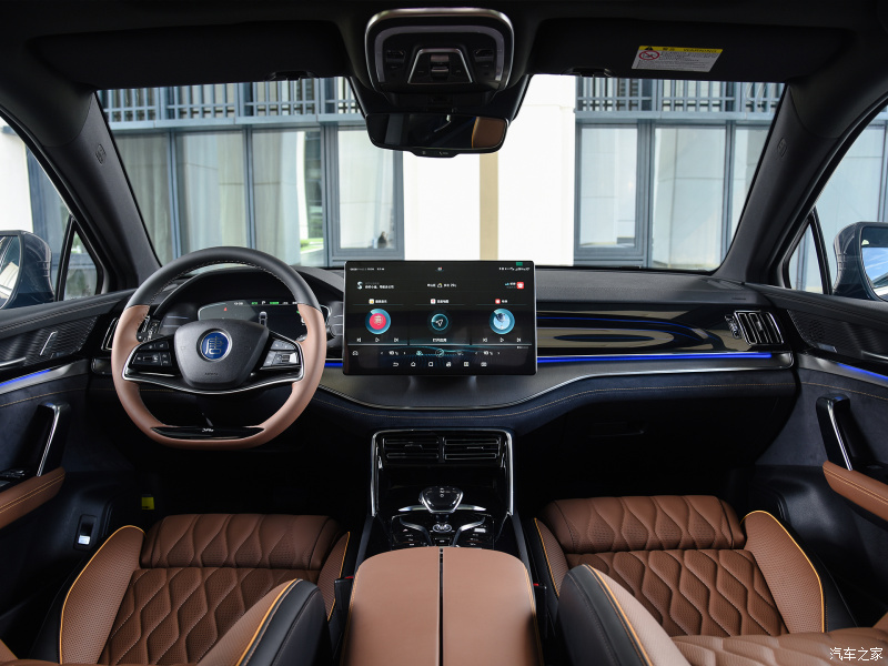 内饰方面采用了比亚迪一贯简洁的设计语言,内饰线条造型平直干脆,层次清晰分明,气势很足。中控台处采用了大面积的黑色烤漆饰板提升档次感,内嵌其中的则是三条纤细的氛围灯带,灯带不仅有31种颜色可选,还能根据空调状态调整对应颜色,视觉效果出色。此外,中控下方还覆盖有百万级车型(如法拉利488GTB)同款的Ultrasuede超纤类麂皮面料,搭配双缝线的工艺足显豪华。中控台整体设计浑然一体,被一大块仿皮柔性材料包裹。随着车联网的不断发展,车机系统的重要性毋庸置疑,DiLink 3.0智能网联系统提供了丰富而实用的多元化功能,搭配15.6英寸的可旋转大屏依旧带来了出众的使用体验。