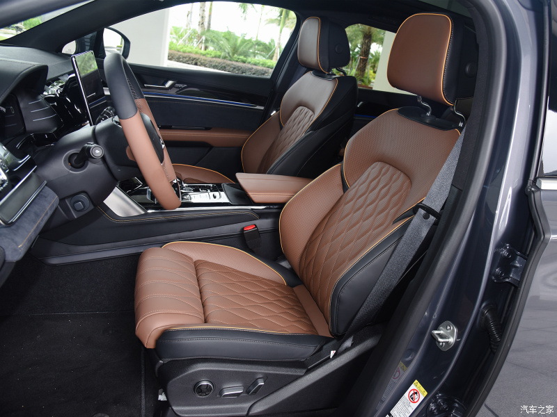 座椅方面,全系座椅布局均采用2-3-2的形式,根据配置的不同分别使用了仿皮/真皮材质包裹,乘坐舒适性也非常优秀。此外,全系车型座椅均配备主/副驾驶座电动调节、前排座椅加热、通风功能,而高配车型还配备腿托调节、腰部支撑及驾驶位电动座椅记忆功能,进一步提升了车内的乘坐舒适性。第二排座椅可以前后移动,椅背也有多个角度调节。