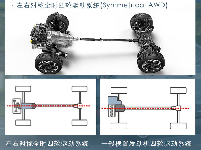 左右对称全时四轮驱动系统是帮助提升驾控性能的一大利器,从结构上来看,传动轴位于底盘中心位置,驱动呈直线左右对称排列在前后轴之间,这种左右对称式的布局,能带来更好的平衡性和驾驶稳定性,正如飞机起飞前会进行左右的配平调整。