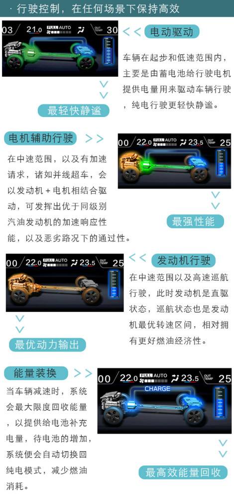 在低速范围下,智能水平对置发动机在大部分情况下仅会以电机驱动,驾驶体感更加轻快静谧;当中高速范围,需要加速的情况下,发动机和电机相结合,共同出力,能带来优于同级汽油机的加速响应性能,尤其在高速状态下特别明显,动力输出更酣畅,特殊情况下,比如一些恶劣路况下,更快的动力响应和更强的动力输出,还能带来更好的通过性。而在面对市区驾驶时,需要车辆频繁进行加速和减速的操作,通过电机的辅助也会使得起步以及停车更为轻快,油耗更低。