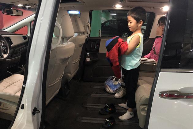 对儿子来说,奥德赛还提供了一个额外的好处。由于小朋友经常需要在车内换衣服,把第二排座椅推到非常靠后的位置之后,车厢中部就出现了一个非常宽敞的空间,这里完全能够让他保持站立(轿车里只能坐着换),大人也仅需坐在座椅上,不用下车就可以帮助他换好。不仅速度快,而且也不受车外环境、温度的影响,体现保姆车的呵护。