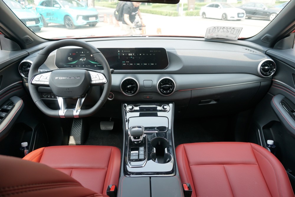 内饰上,中控台采用了较为简洁的风格,中控配有双联屏,同时采用电子挡杆,极具科技感。在细节上,内饰采用了仿碳纤维纹路的饰板、红色缝线和红色座椅,让车内依旧充满运动感。