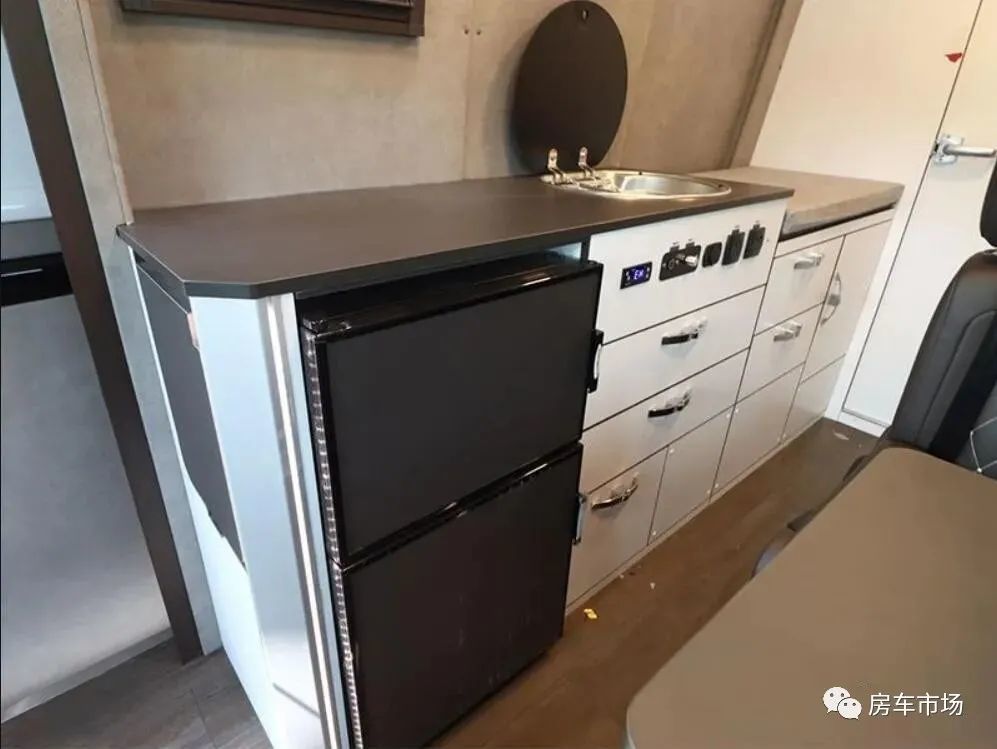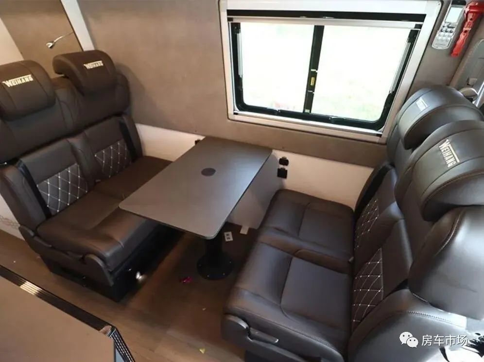 会客区设计为双人对坐式卡座,配有三点式安全带,中间为可升降式餐桌,内侧设计有通风换气的车窗,上部空间则设计有一排储物吊柜。会客区顶部安装有定制驻车空调。对面是厨房的操作台,配置有双开门车载冰箱、洗菜盆、以及丰富的储物抽屉以及储物柜。