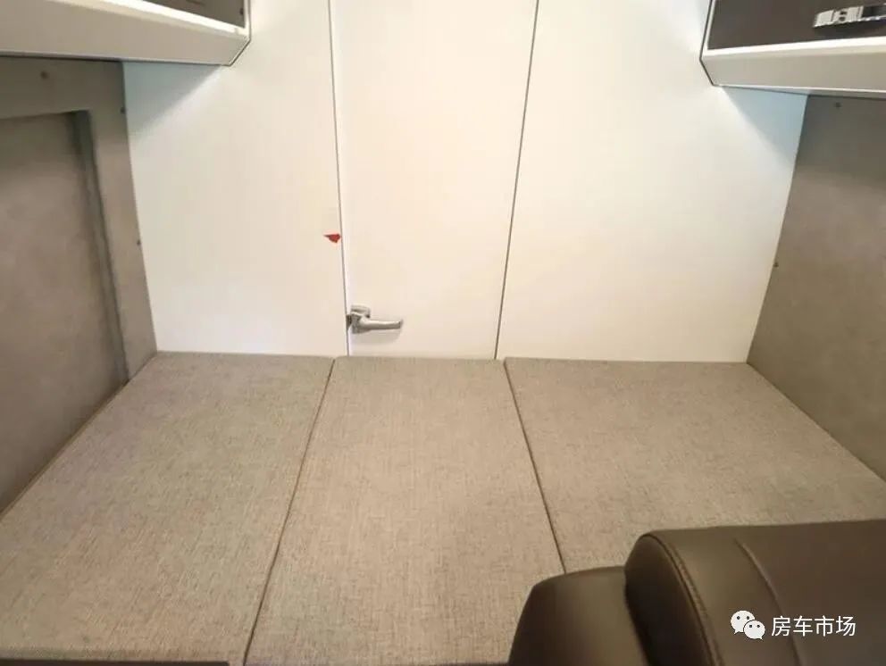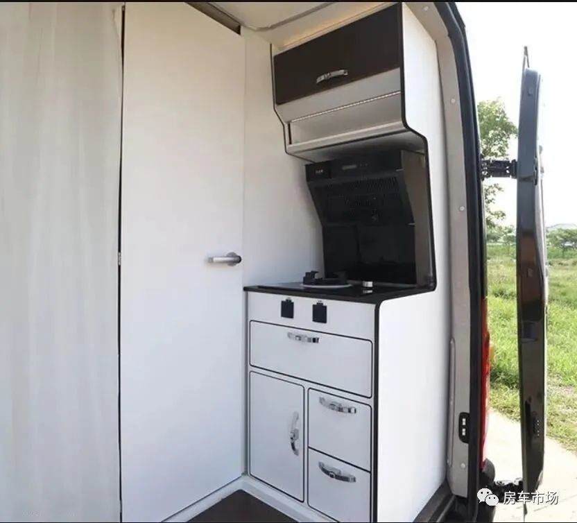 新车采用6座2卧的设计,除了对卡座能拼床之外,在会客区的后部设计有一张独立的单人床,尺寸是1.8*0.9米,床板采用拼折式设计,并不影响日常的通行。而在车尾部设计有该车的一体式厨卫区域,通过一扇门与前部区域分隔,厨台设计有集成式单眼炉灶+大功率抽油烟机,把尾门打开后可在这里进行日常烹饪。而新车的卫浴功能相对简单,配置有马桶、抽拉式淋浴、面盆等。