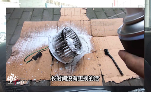 再用空调杀菌除臭剂,直接喷在蒸发箱的表面。