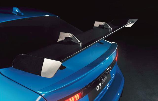 再加上符合空气动力学可有效降低风阻系数并增加下压力的流线车身(风阻系数Cd仅为0.27,升力系数为-0.025)、造型动感的多幅式轮圈、上斜45°的车身尾部设计,结合上翘4.7°可以最大提供11公斤下压力的尾翼、可实现有效减少车尾涡流的鲨鱼鳍天线、尾部导流板、夸张但不造作的双边单出的排气组合、全LED尾灯,以及像极了俯身准备前冲豹子的前向低趴车身,整体在猛烈而极具视觉冲击感的视效中,处处都透露出领克03的独有性能气质。