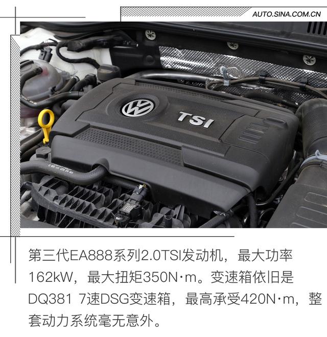 全新帕萨特搭载了第三代EA888系列2.0TSI发动机,采用了米勒循环技术,通过控制进气门提早关闭,达到少进气、多做功,最终实现节油效果。最大功率162kW/4500-6200rpm,最大扭矩350N·m/1500-4400rpm。DQ381 7速DSG变速箱,最高承受420N·m, 此外还了增加电子油泵,支持发动机启停,优化内部滚阻,提高机械效率。