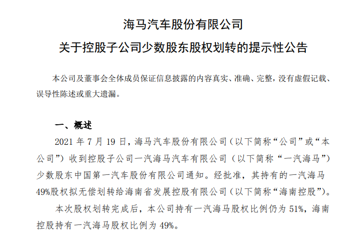 而与一汽的“分手”,更像是引爆海马汽车股价的导火线。7月20日晚,海马汽车发布公告称,其控股子公司一汽海马汽车有限公司的少数股东发生了变更,原一汽股份所持有的一汽海马49%股权,拟无偿划转给海南省发展控股有限公司。而本次股权划转完成后,海马汽车持有的一汽海马股权比例仍为51%,海南控股持有一汽海马股权比例为49%。