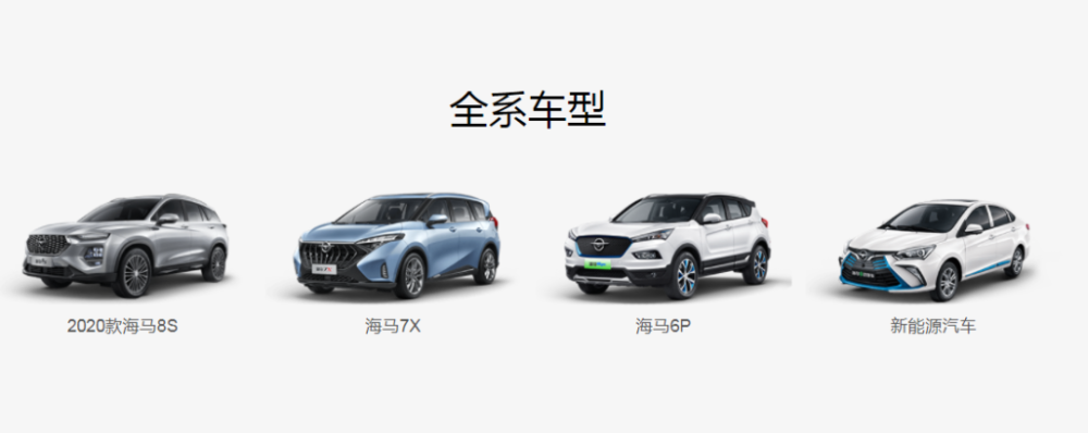 在海马汽车的官网上可以很容易地发现,现阶段,海马汽车将自家的车型分为了四大块:主打SUV的2020款海马8S、主打MPV的海马7X、混动车型海马6P,以及备受关注的新能源汽车。