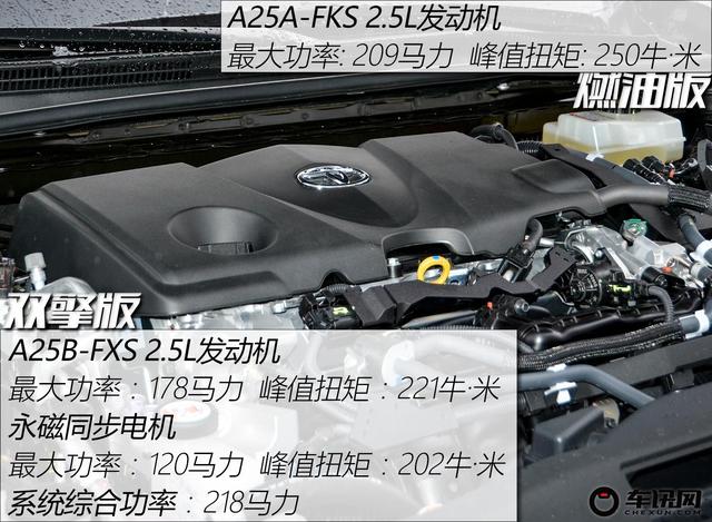 亚洲龙拥有双擎版和燃油版两种动力组合,均使用的是2.5L自然吸气发动机。其中,燃油版车型A25A-FKS的2.5L发动机最大功率209马力,峰值扭矩250牛·米,与之匹配的是8挡自动变速箱;双擎版车型的动力系统是由2.5L发动机、永磁同步电动机以及E-CVT变速箱组合而成,综合输出功率为218马力。