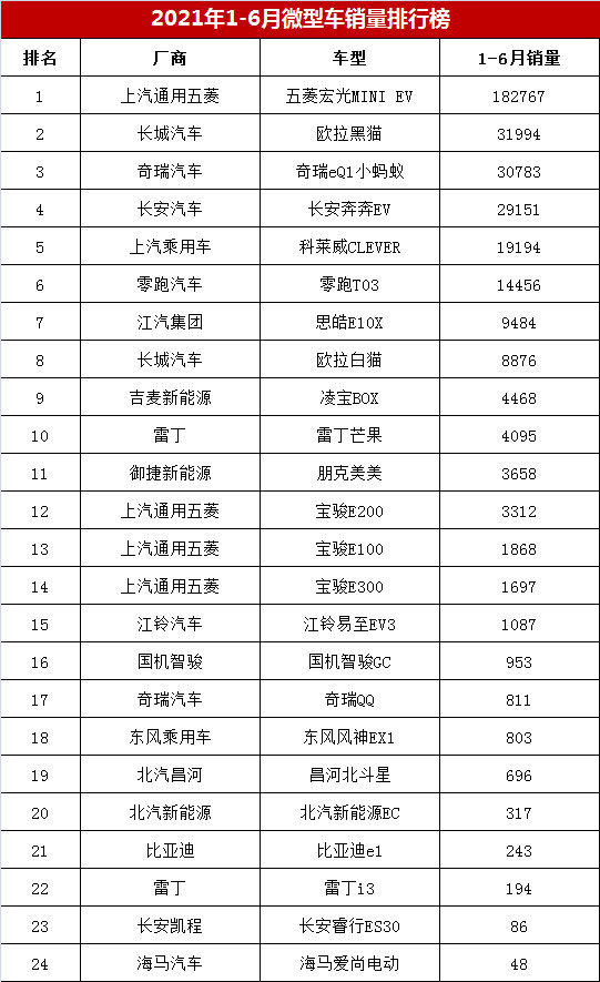 【2021年1-6月轿车销量排行榜 上半年微型车销量排名】今年以来,以新能源汽车为主体的微型车市场发展迅猛,销量大幅增长。据购车网编辑日前整理统计显示,2021年1-6月微型车市场累计批发销量达到35.10万辆,同比暴涨599%。