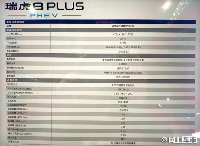 网上车市了解到,奇瑞瑞虎8 PLUS-PHEV版将于10月正式上市。新车外观内饰延续燃油版车型设计语言,动力上搭载1.5T插电混动系统,零至百公里加速时间仅需4.9秒,综合油耗低至1.25L/100Km(馈电情况油耗4.9L),每公里油费约合8分钱,油耗相比现款车型大幅降低。售价方面,预计新车售价在18万元左右。