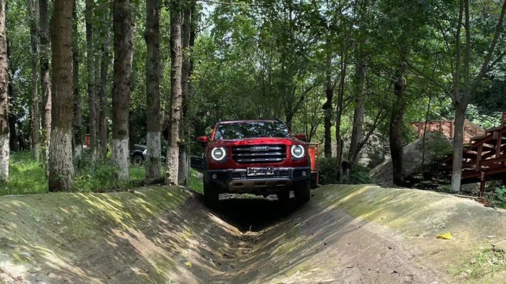首先介绍一下此次试驾的基本情况,越野场地位于成都麓湖的中国现代五项赛事中心内。说实话,越野难度并不算太大,并没有陡坡交叉轴转弯叠加那种极端路况,但中等程度的土坡驼峰、石块路、侧坡、枕木路、炮弹坑、泥泞和涉水路都涉及到了,基本算得上是常规自驾游能遇到烂路中的“高配”了。我试驾的车型是哈弗大狗2.0T四驱顶配,搭载一台211马力、235牛米的2.0T发动机,匹配7速湿式双离合变速箱。