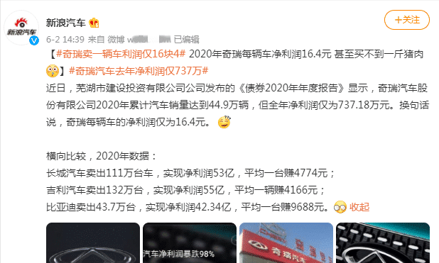 对于如此优秀的奇瑞汽车品牌,虽说近年来汽车销量在不断增长,但是奇瑞集团的净利润却低于行业水平以下。