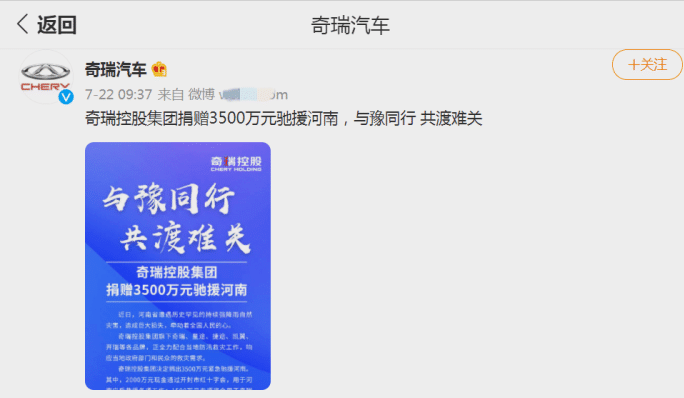 凭啥别的企业捐款1000万、1500元能上热搜,而奇瑞汽车默默捐出3500万元,却迟迟没有人为之兴奋,这着实让人为奇瑞感到心酸。