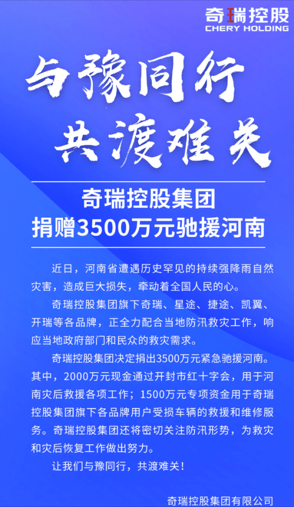 我们从奇瑞官方渠道获悉,奇瑞控股集团在这次河南抗洪救灾行动中,共计捐献出了3500万救济款项。