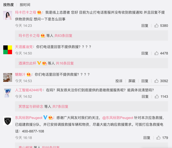 东风标致救援服务信息发布后,多位网友爆料称,拨打东风标致提供的救援电话却被告知不提供救援和物资。为此,网友们纷纷质疑东风标致存在“发布虚假救援宣传”、“蹭灾情热度”。面对网友的质疑,东风标致官方再次发布微博回应:“对本次应急救援,已组建援分队,并已安排调拨救援车辆和物资,尽最大能力响应救援需求。”