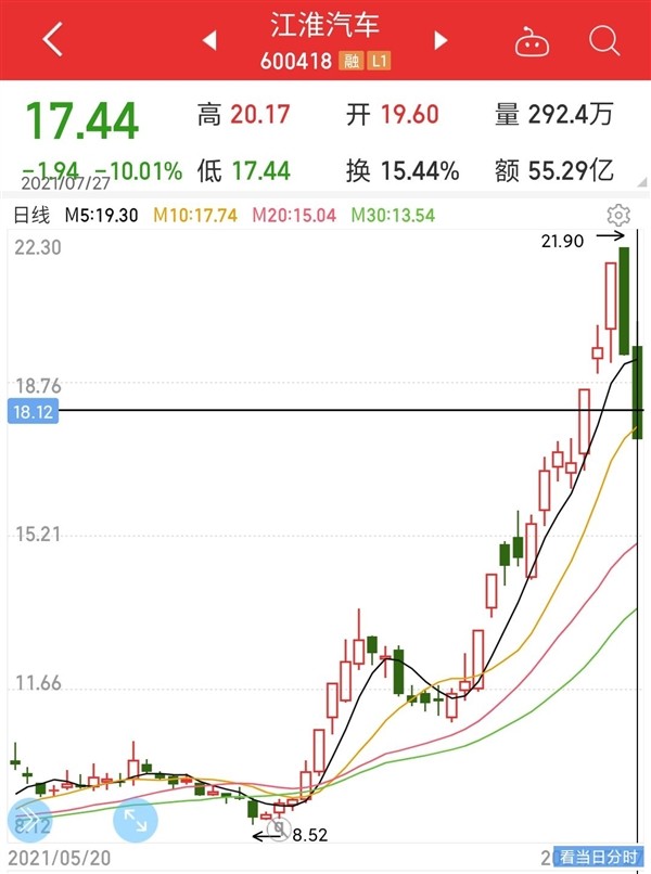 另外,近段时间,江淮汽车在资本市场接连走高,6月22日,江淮汽车的收盘股价为9.75元,而在7月23日,一个月的时间,其股价就暴涨到了21.9元,暴涨一倍多。而这或许与江淮汽车即将接下大单有关。