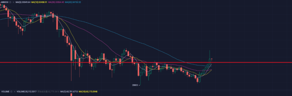 今天日内的最低位置在36000美元便开始反弹了,说明市场的多头力量还是存在的,而且这一波反弹,让行情直接从低迷段回到了震荡的上半部,也称得上是乐观。接下来还是要关注一下,这波上涨之后的回调反弹能稳定在哪里。
