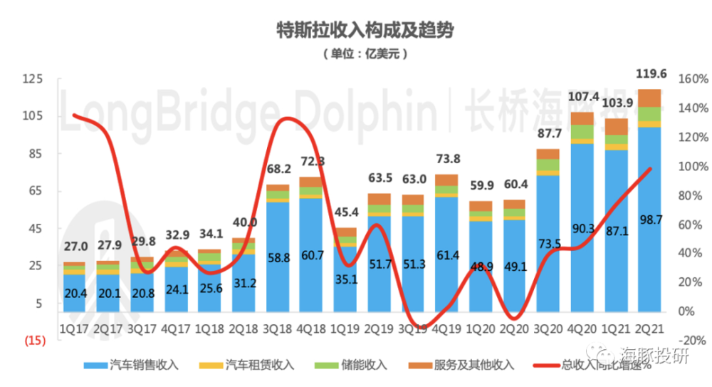 收入同比翻倍,超预期。2021年二季度特斯拉实现营收119.6亿美元,同比增98.1%,环比增15.1%,营收增长的主力贡献仍是汽车销售业务,不过占比较小的储能和服务业务也维持较好的增长态势,超出彭博一致预期(113.71亿美元)。
