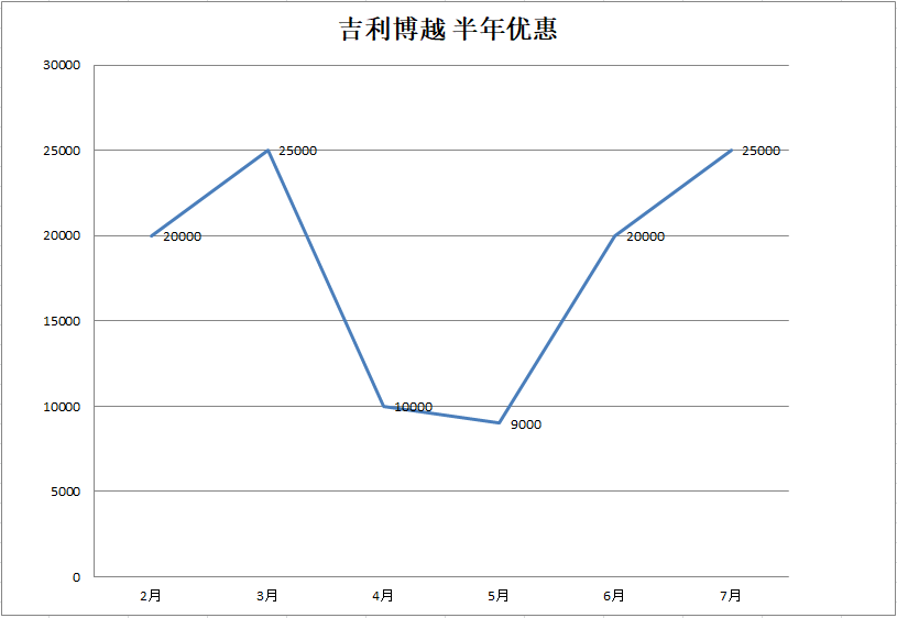 春节期间,博越迫于销量压力,在其他汽车品牌都在缩小优惠幅度的时候,给出了一个2.5万元的优惠,令其收获了不少订单。可是进入4月后,其优惠一下缩水至1万元,5月更是跌至9000元,和以往的大气让利完全不成正比。好在进入6月,博越又开启了大降价模式,优惠直接冲上了2万元,7月更是恢复到了春节期间2.5万元的水准。因此,对于喜欢博越并且最近有计划想要购车的朋友,此时入手非常划算。