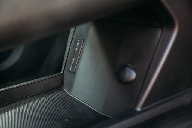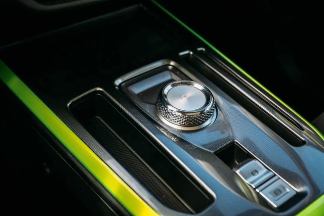 而再往下的中控池部分就值得说道说道了。旋钮式的电子挡杆被居中放置,整个中控池也由此被分割成了左右两部分,左边是一个容积稍大的置物槽,右侧则是一个手机槽加一个卡槽。而如果能将挡杆的位置往主驾一侧靠,其实能够留出更多的空间。