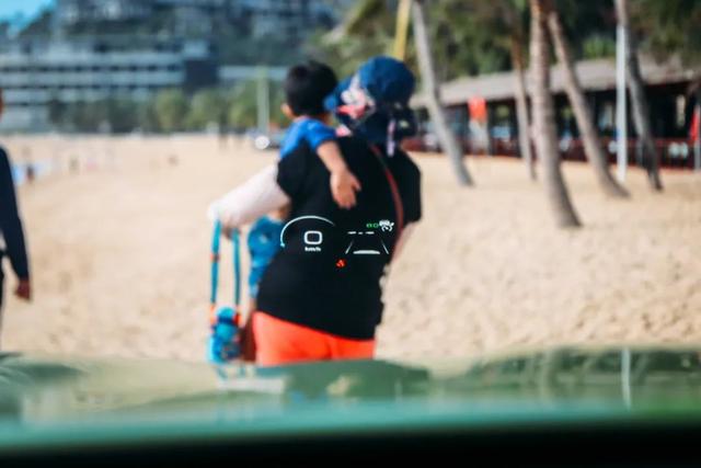 除了液晶仪表和中控屏,我们试驾的顶配版本还给到了HUD抬头显示。当然有一说一,在三亚正午的超强阳光下,这块屏幕的亮度就显得较为一般了,以至于在拍摄这张图片时,恰巧车前有身着深色衣物的路人经过,否则HUD的投影内容并不是那么容易看清。