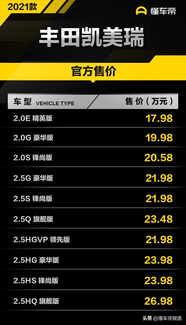 如前所述,新款凯美瑞无论是2.5升自吸还是2.5升混动车型均提供了豪华版、锋尚版和旗舰版。不过除此之外,后者还额外提供了一款2.5HGVP 领先版作为混动版车型的入门选择,这里我们把它单独列出来分析。
