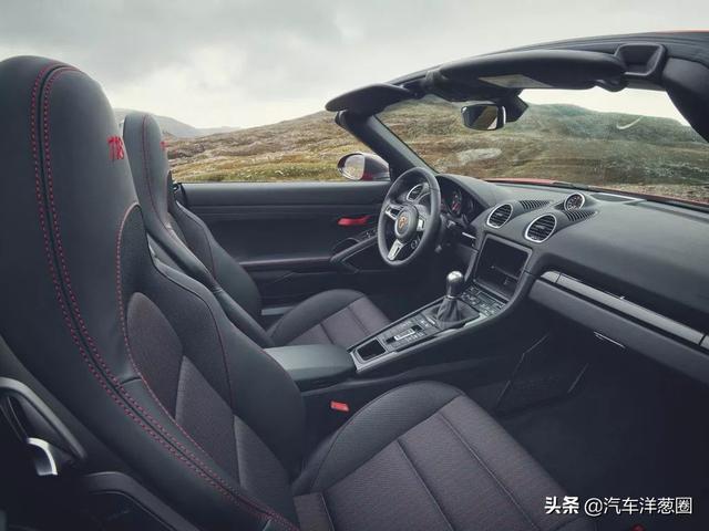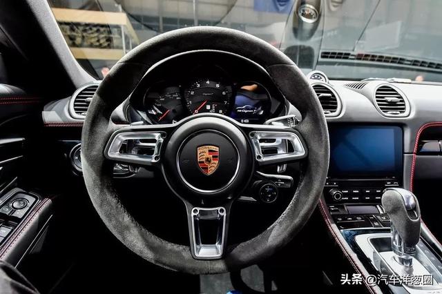 718 T为了驾驶乐趣,在内饰轻量化的方面可谓是下足了功夫。原厂取消了中控多媒体系统(可以免费选装回来),门把手也采用了编织拉带的形式。方向盘更换成了没有任何按键的GT运动型镂空方向盘。