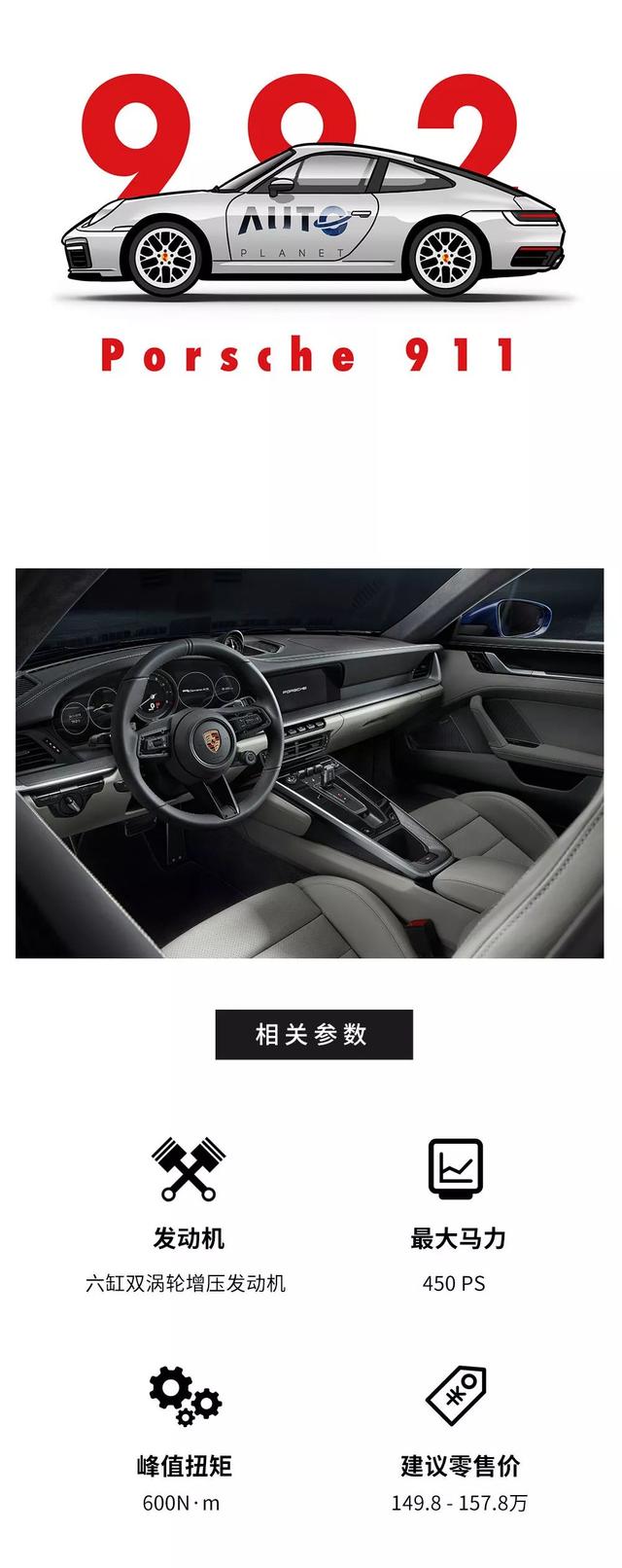 底盘代号为992的全新保时捷 911,采用大众集团的MMB平台进行打造,轴距长度比旧款的增加了40mm。动力系统全面涡轮化,入门级Carrera S搭载高功率版3.0升水平对置六缸双涡轮引擎,传动系统升级为第二代 PDK 八前速双离合变速箱,变速箱的控制轴由原来七速的双轴升级成现在的四轴。