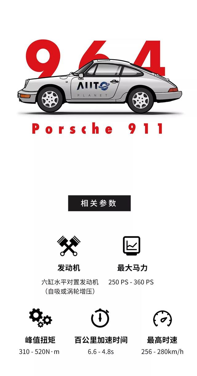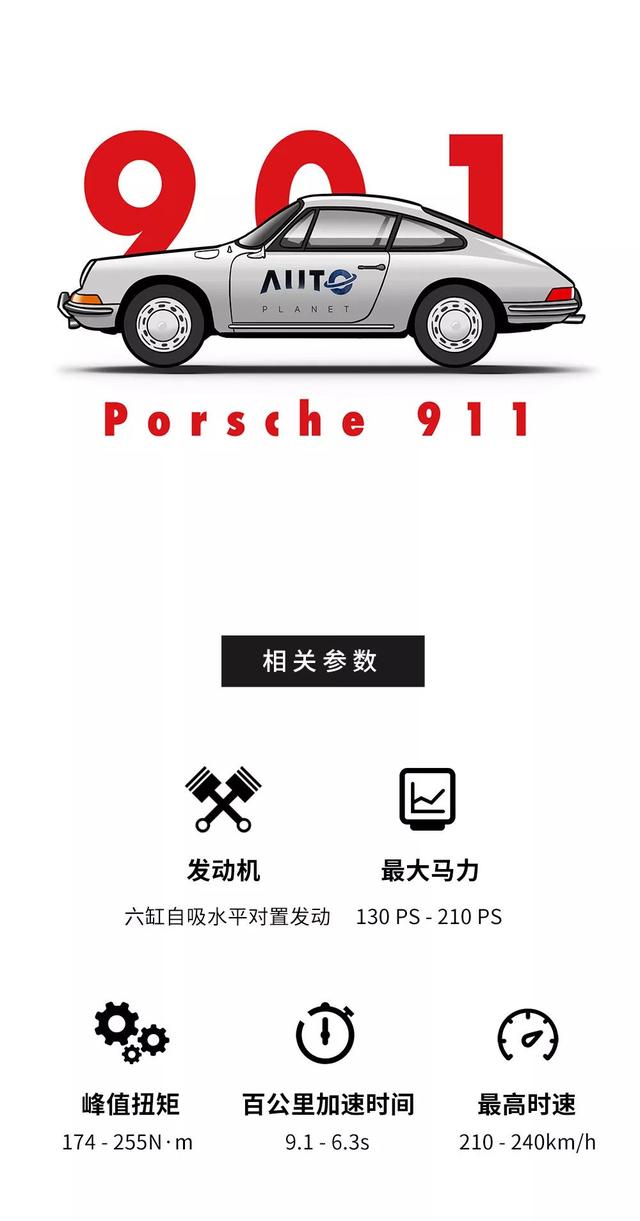 最早期小批量出来的901系列,沿用356时代的一款2.0L风冷水平对置的四缸引擎,最大马力输出为130匹。之后名字改为911,虽然同样采用后置的风冷水平对置发动机,不过汽缸数增加为6个,这台发动机最依然维持在最大130马力、峰值扭矩161N·m,与之搭配的是一款新的5速密齿轮比手动变速箱。百公里加速时间为9.1秒,最高时速210公里/小时。