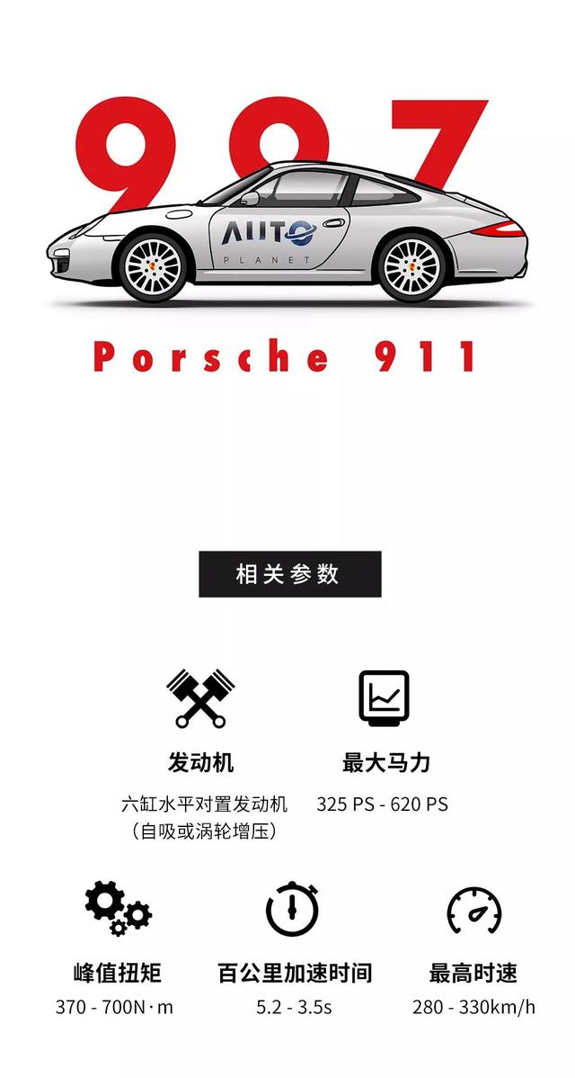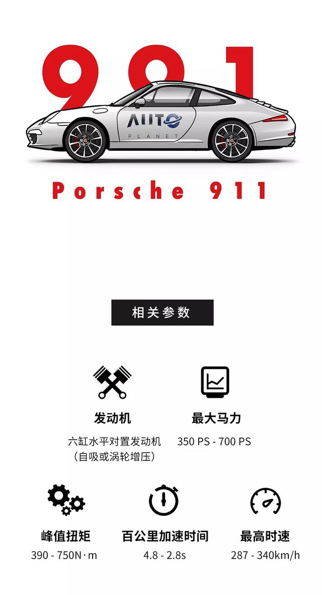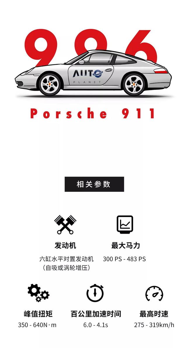 后续那些高性能的版本例如采用360马力3.6升自然吸气发动机的911 GT3和2000年415马力的第四代911 turbo,它们0-100km/h的加速时间分别为4.7秒和3.9秒,最高时速为302km/h和304km/h。而当年的996最终极版本911 GT2的3.6升双涡轮发动机甚至可以输出462马力、620N·m的最大输出,极速一度超过315km/h!