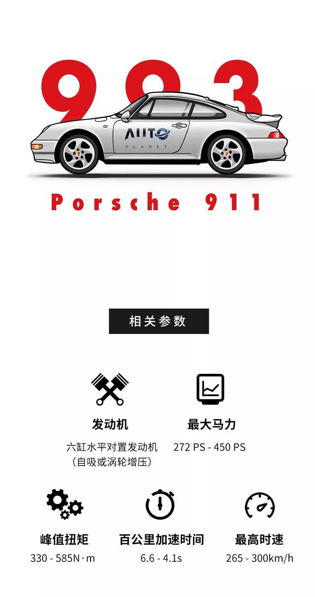 993在整个911车系的发展进程中基本上就是一道华丽的分割线,它被评价为“机械与艺术的完美结合”,也是最后的风冷发动机守望者。第一次采用后多连杆悬挂设计、轮距加宽,第一次搭载6MT变速箱、第一次搭载cd机、双三元流量排气、更大的制动卡钳、四轮通风盘。除了性能了得,同时993也是当时世界上第一批拥有OBD诊断系统的生产车辆之一。