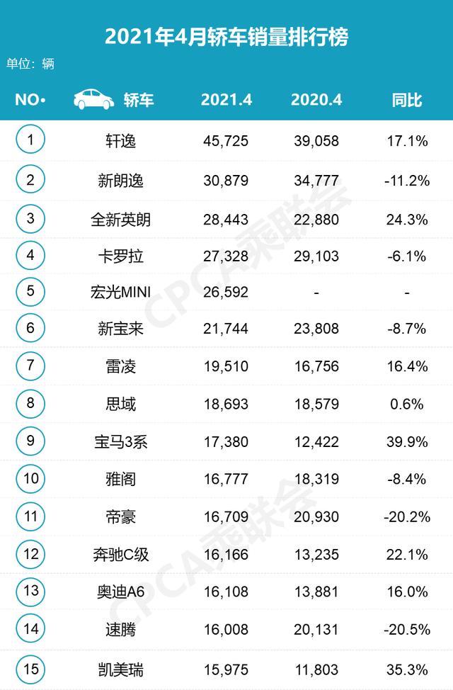 那么,时间已经是2021年5月中旬的当下,雷凌的销量到底怎么样了呢?恰好近期乘联会公布了4月份轿车销量排名TOP15,也就是下方表格,从中可以看出,雷凌在当月销量为19510台,排名榜单的第7位,比思域的销量还要好。