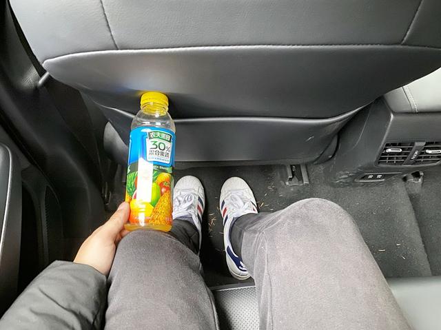 虽然雷凌的空间并不让人担心,但我还是实测了一下空间表现。它的尺寸为长宽高4640*1780*1455mm,轴距2700mm。在前排调整到标准驾驶坐姿下,后排腿部还能塞入一个饮料瓶(如下图)。此外,后备箱空间表现也不错,在实用性方面有很好的保证。