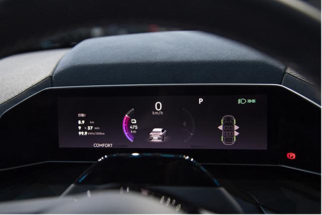 8.8英寸的全液晶仪表,也是细长条风格的。是否反光、是否漏光这些,还有待测试。
