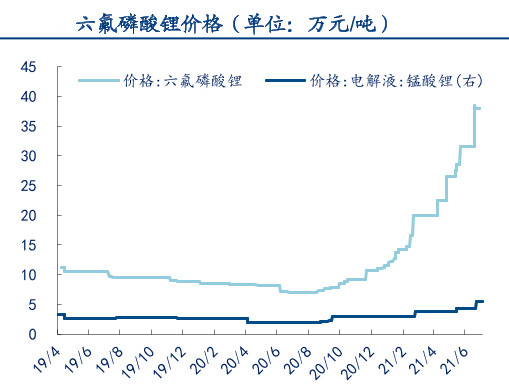得益于新能源市场的火爆,六氟磷酸锂价格从去年7月不到7万/吨一路涨到现在市场主流报价36-43万/吨,整整涨了6倍左右。可以说在新能源产业链上游当中傲视群雄,其中较年初同比增长就超过了4倍。