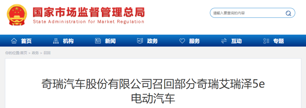 奇瑞汽车股份有限公司召回部分奇瑞艾瑞泽5e电动汽车