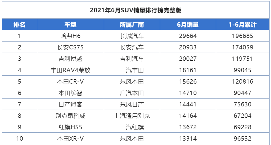 更大的问题在于,即便途岳价格如此跳水,似乎也没有影响到竞争对手的销量。2021年6月份,哈弗H6的销量(批发销量,下同)依然达到3万台,途岳最直接竞争对手本田CR-V销量也超过1.5万台,而途岳自己的销量只有2372台,上半年累计销量也不过4万多台。