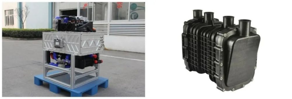 在合作企业转化的燃料电池发动机系统成品(左)和增湿器成品(右)