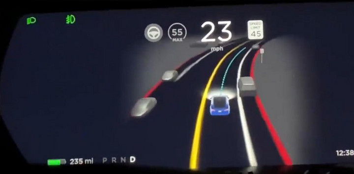 新版本的可视化界面UI更为精细,道路和车道表现,都用不同颜色标线表示,不同车型也都有不同的模型显示。
