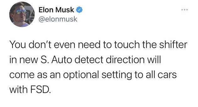 特斯拉CEO马斯克表示,在新款Model S上,你不需要通过触控来换挡,自动换挡功能将会作为一个选项,开放给所有配备FSD功能的车型。