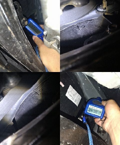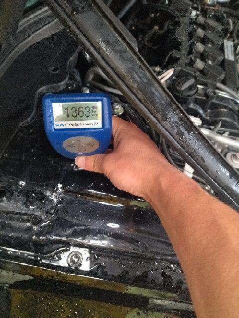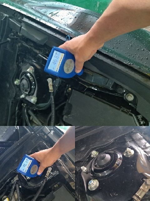右侧减震包这块,用漆膜仪测一下避震包的漆面,数据大的惊人!钣金修复了!果然有事,悬挂是重要的框架结构件,任何损伤修复都可以认定为国标事故车,这车已经没有悬念了,只是还要查清楚事故损伤程度。
