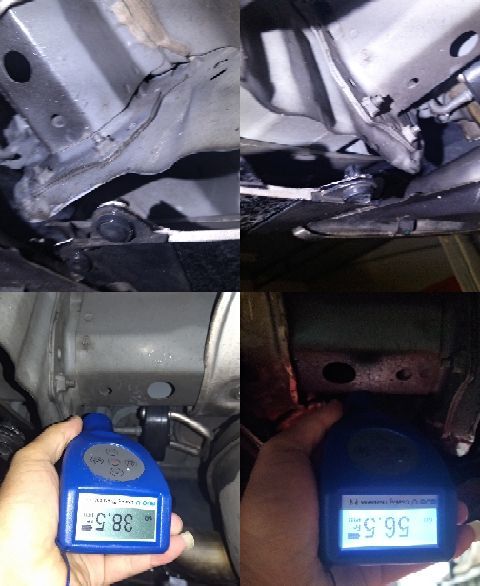 迫不及待的检查两个前纵梁,左侧纵梁未见明显异常,漆面数值为36.8μm,再看看右侧,华丽丽的一道弯曲,还有烧焊修复痕迹,漆面数据1142μm,右侧纵梁受损修复,5级事故车,宣判死刑了。