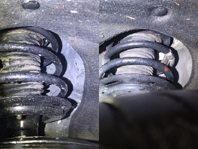 把左右避震包两张图片放到一起,两相对比,一眼就可以看到不同了吧!左边这个避震包没有胶体,颜色也不对,它就是修复过的右侧避震包。