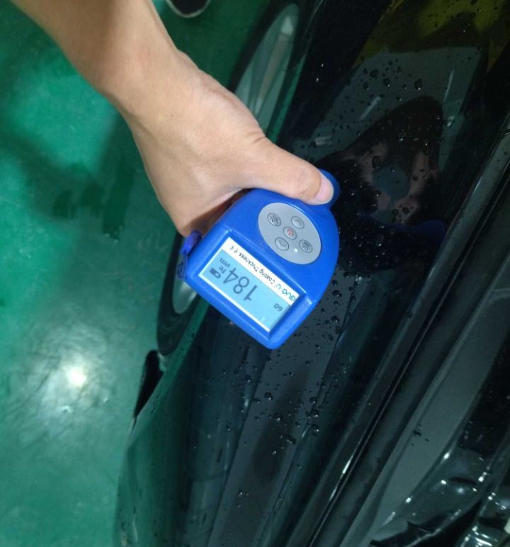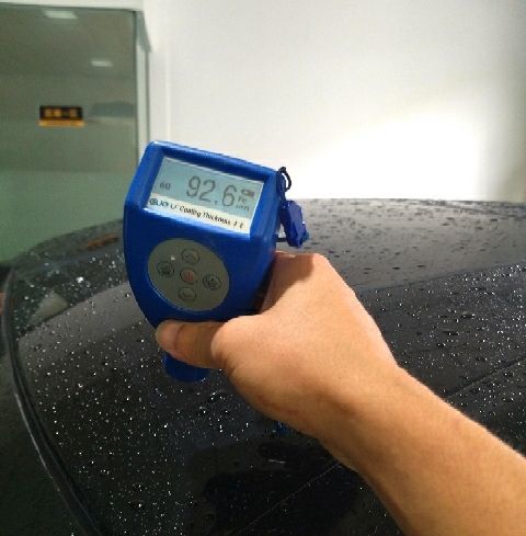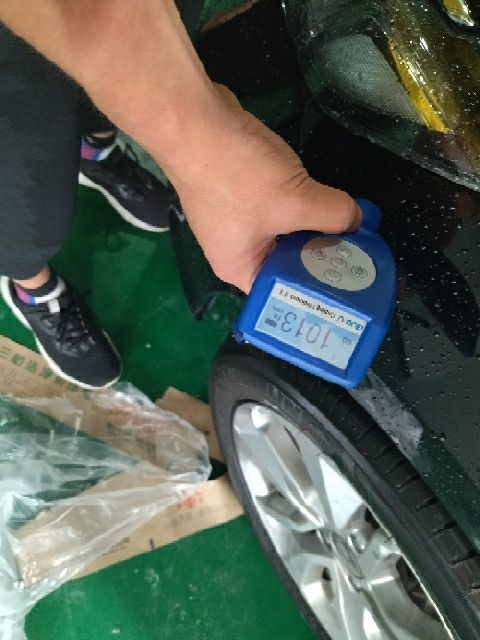 接下来我们选择一个不经常磕碰受损的地方,取一个漆面数据作为标准值做参考。前后机盖、叶子板和车门都不适用,因为这些地方平时用车容易刮蹭到。所以,我们一般是以车顶做为第一选项,然后A柱、C柱备选,观察到车顶没有后喷漆的脏点颗粒感等,那么取下来的标准值就在90μm-111μm区间。