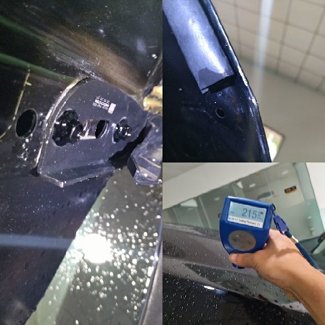 左前门局部漆面厚度偏高,但铰链螺丝,锁块以及限位器都没动过,所以只是钣金喷漆,并没有更换。