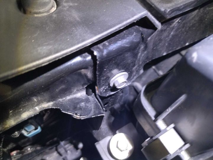 从发动机舱正前方的水箱框架开始,水箱框架明显可以看到有变形焊接,机盖锁块的固定螺丝有拆卸,水箱框架表面还有掉漆的情况,阿伟我判断水箱框架是切割更换了。