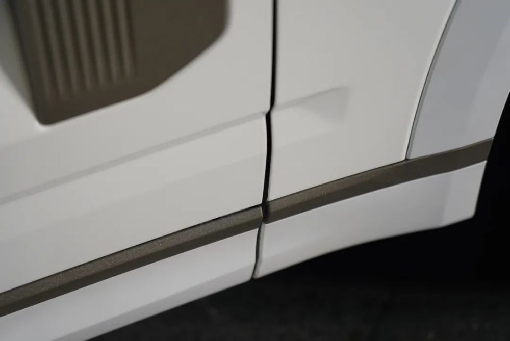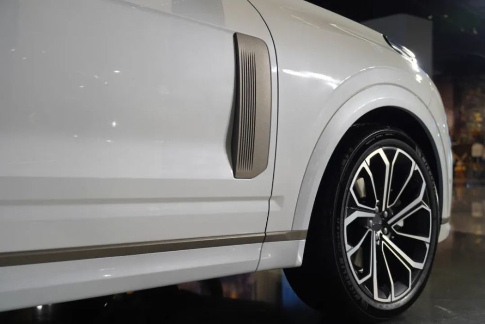 说到细节,这次实拍的两款SUV车型都不再使用廉价的黑色硬塑料材质作为车身一圈的饰件,而基本是和车身同色的饰件。同时在简约的车身上增加了一道很“路虎揽胜”的竖状宽幅饰条,只是这个材质很有趣,是一种磨砂质感的哑光金色。再加上车底侧裙也有一圈同样材质的纤细饰条,这样给原本魁梧的领克09增加了许多精致细节,也更好的表现出豪华车的气质。