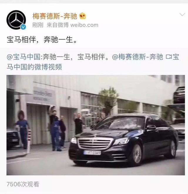 5月22日宝马中国发布了一则视频,配文“奔驰一生,宝马相伴”,其目的是致敬奔驰董事会主席蔡澈。因为他将在2019年5月的戴姆勒董事大会上正式卸任,结束其在戴姆勒集团42年的职业生涯。很快,奔驰转发了宝马发布的消息,并配文“宝马相伴,奔驰一生”……